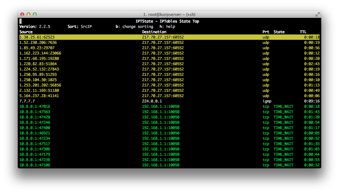 Ещё одна утилита для работы с сетью. Используя iptstate, может в интерактивном режиме посмотреть, как трафик проходит через брандмауэр, произвести сортировку по различным критериям, отфильтровать и даже даёт возможность их убить.
